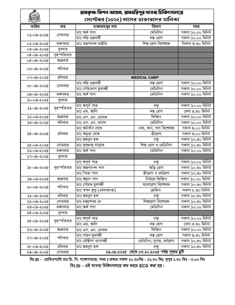 The Swami Maheshwarananda Charitable Dispensary, established by the revered founder of Ramharipur Ramakrishna Mission Ashram, stands as a symbol of selfless service and compassion. Originally started by Swami Maheshwarananda Maharaj himself—an accomplished allopathic and homeopathic doctor—the dispensary began as a humble effort to provide free treatment to rural villagers. Over time, it evolved into a permanent healthcare center, officially relocated in 1980 under the guidance of Swami Udanananda Maharaj. Today, the dispensary offers both allopathic and homeopathic treatments, reaching not only Ramharipur but also several neighboring villages. Every year, thousands benefit from free medical consultation and medicines. Special outreach programs and visiting specialist doctors ensure that even the most underprivileged receive timely and quality healthcare. This dispensary continues to embody the Ashram’s mission of serving humanity with love, care, and dignity.